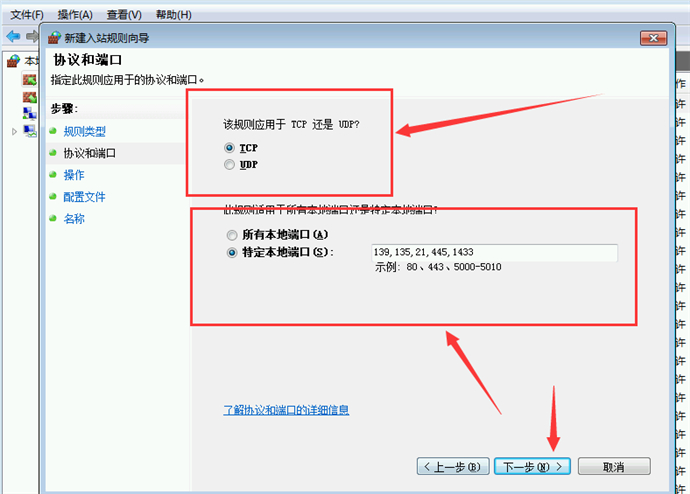 8、在右側(cè)的選擇夾中選中“TCP”單選框,并編輯框內(nèi)輸入要封閉的端口號:139,135,21,445,1433,3389。點擊“下一步”注:端口相當(dāng)于操作系統(tǒng)的門,windows操作系統(tǒng)共計65535個端口。常被黑客利用的端口有:139、135、21、445、1433、3389。